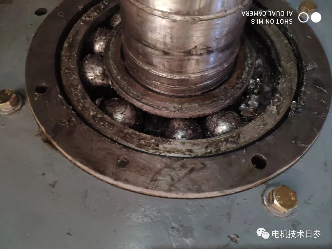在這類故障電機(jī)的解剖過程中可以發(fā)現(xiàn)至少有以下一種表象:軸承或缺油的干磨狀態(tài);潤(rùn)滑脂發(fā)生變黑、結(jié)塊;軸承已發(fā)生明顯的機(jī)械性或電腐蝕損傷。